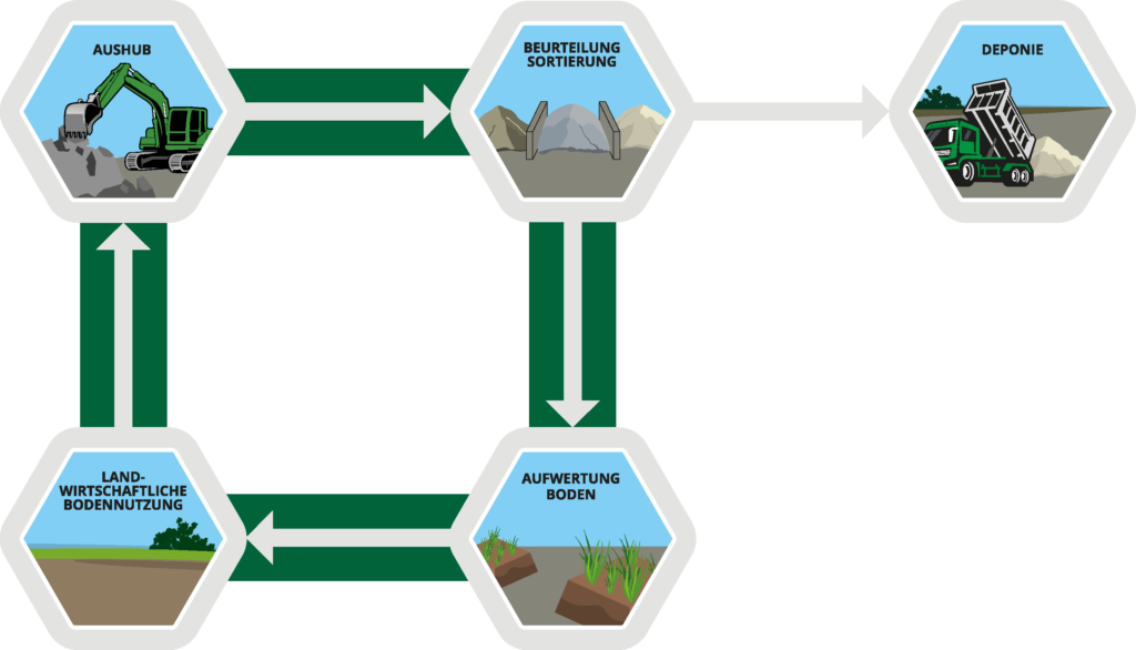 Der nicht verwertbare Boden aus Aushubarbeiten wird umweltgerecht entsorgt und in streng kontrollierten Deponien abgelagert. Deponiert wird ausschliesslich unverschmutztes und ökologisch unbedenkliches Bodenmaterial.